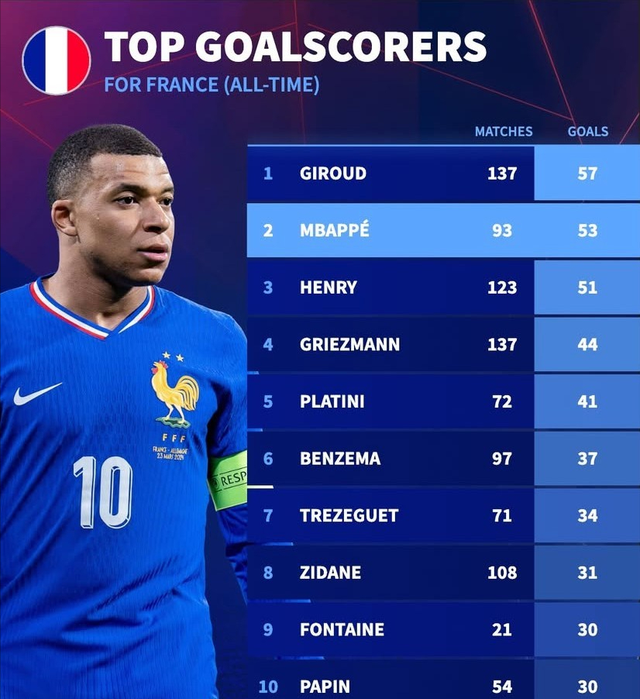 咱们言归正传,看看法国队的历史射手榜上还有哪些巨星。咱们上文说过了,高中锋吉鲁,137场57球,即战力第一人姆巴佩,93场53球,分别排名第一和第二。